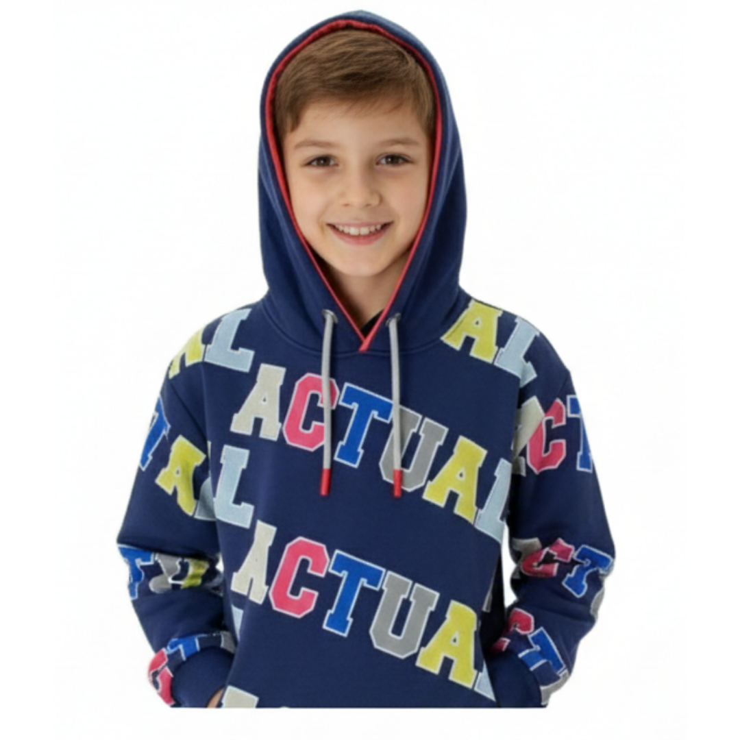 Erkek çocuklar için özel olarak tasarlanan lacivert baskılı kapüşonlu sweatshirt, modern görünümü ve konforlu yapısı ile günlük kullanımda mükemmel bir tercih sunar.