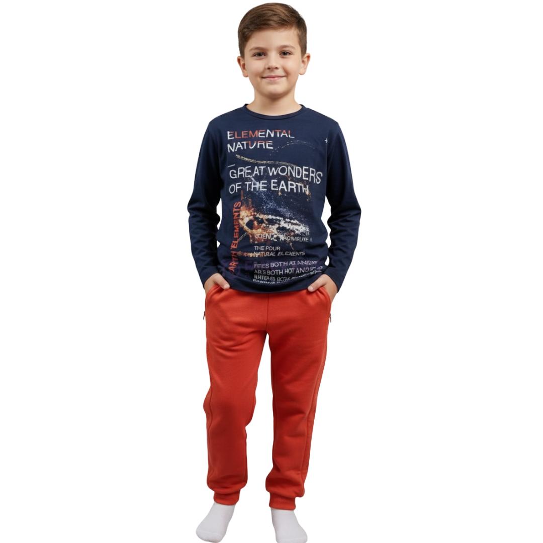 Erkek çocuklar için özel olarak tasarlanmış Lacivert–Kiremit Baskılı Sweatshirt İkili Takım, gün boyu konfor ve şıklığı bir arada sunar. Üst parça %100 pamuktan üretilmiş olup, nefes alan yapısı sayesinde hassas çocuk ciltleri için ideal bir kullanım sağlar. Lacivert sweatshirtün üzerinde bulunan dijital baskı, canlı renkleriyle modern ve sportif bir görünüm kazandırır. Tam kalıp rahat kesimi sayesinde hareket özgürlüğü sunar ve günlük kullanıma mükemmel uyum sağlar.