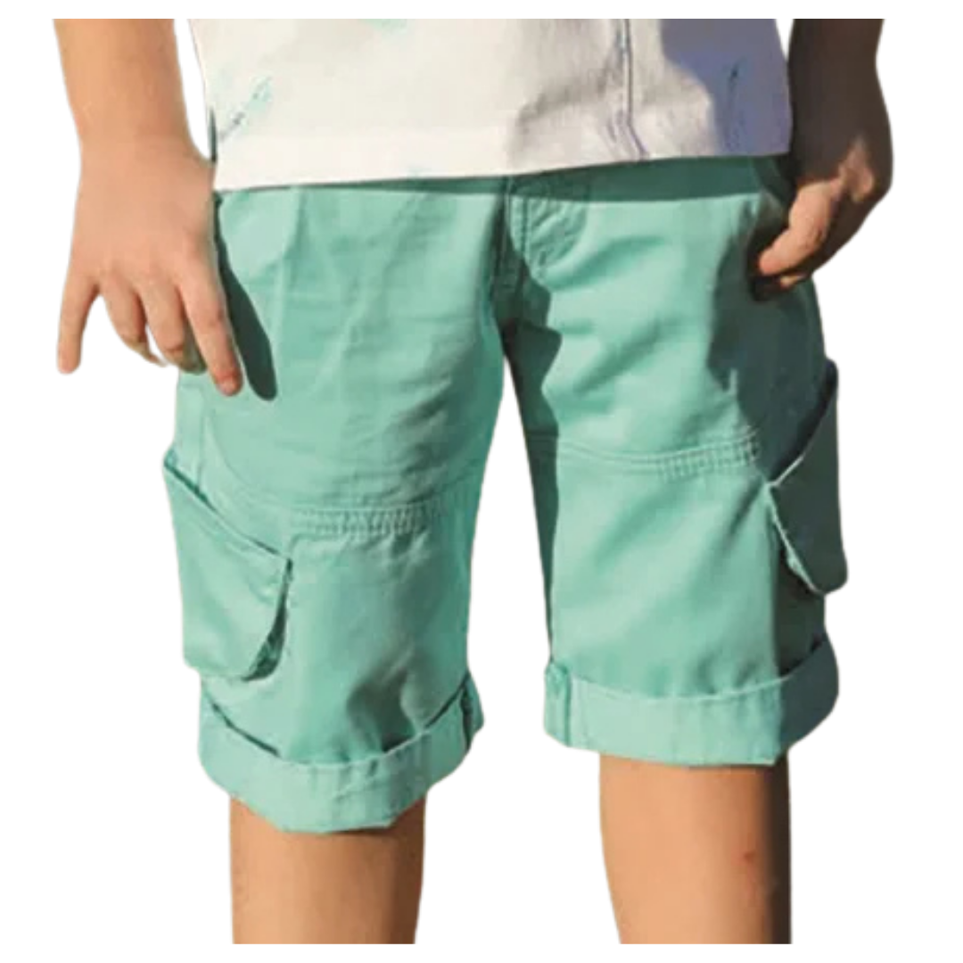 Erkek çocuklar için tasarlanan turkuaz renkli kargo cepli kapri şort, yaz aylarında hem şık hem de konforlu bir seçenek sunar.
