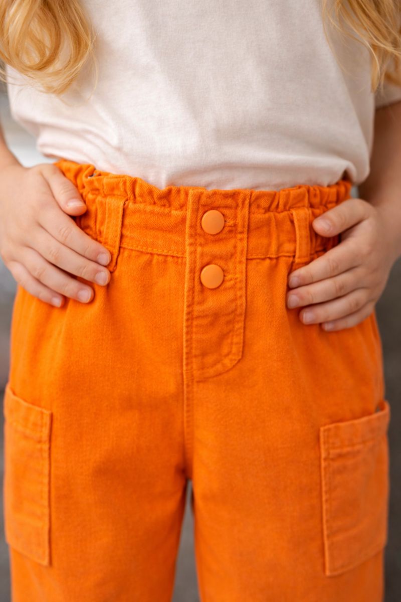 Kız Çocuk Açık Turuncu Kargo Cepli Pantolon, %100 pamuk içeriği sayesinde yumuşak, esnek ve teni rahatsız etmeyen dokuma kumaş yapısına sahiptir.