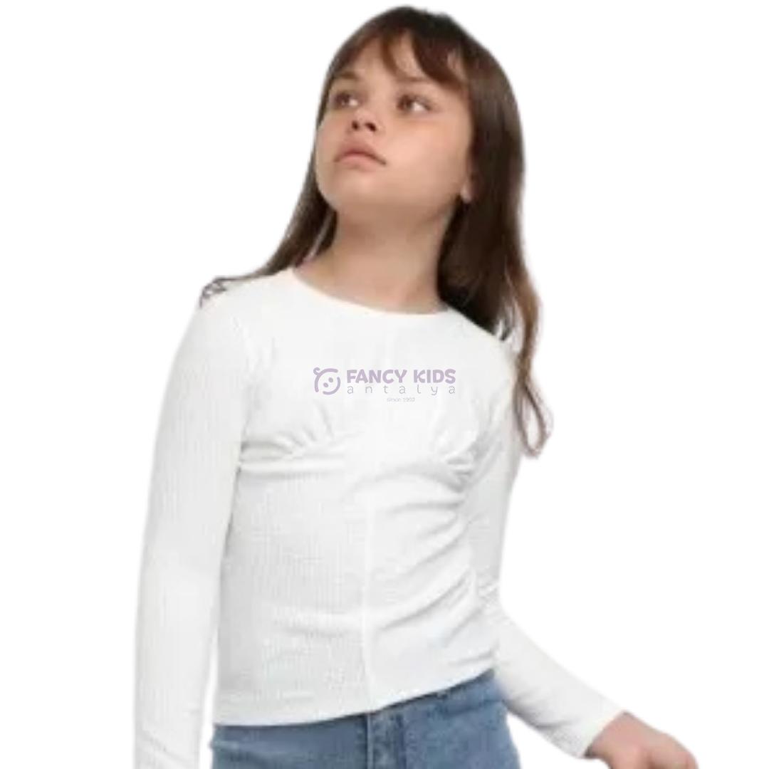 Kız çocuklar için tasarlanan beyaz uzun kollu kaşkorse bluz, zarif ve şık görünümüyle her kombine uyum sağlar.