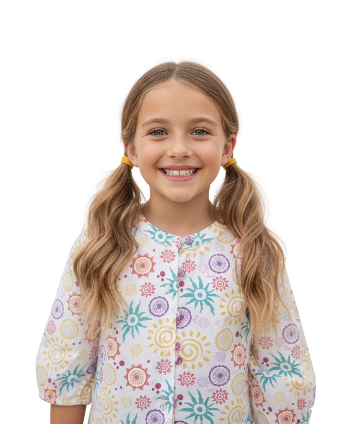 Kız çocuk çok renkli baskılı bluz, %100 pamuk yapısı sayesinde gün boyu konfor sunan, rahat kullanımlı ve nefes alabilen kız çocuk bluz modelidir.