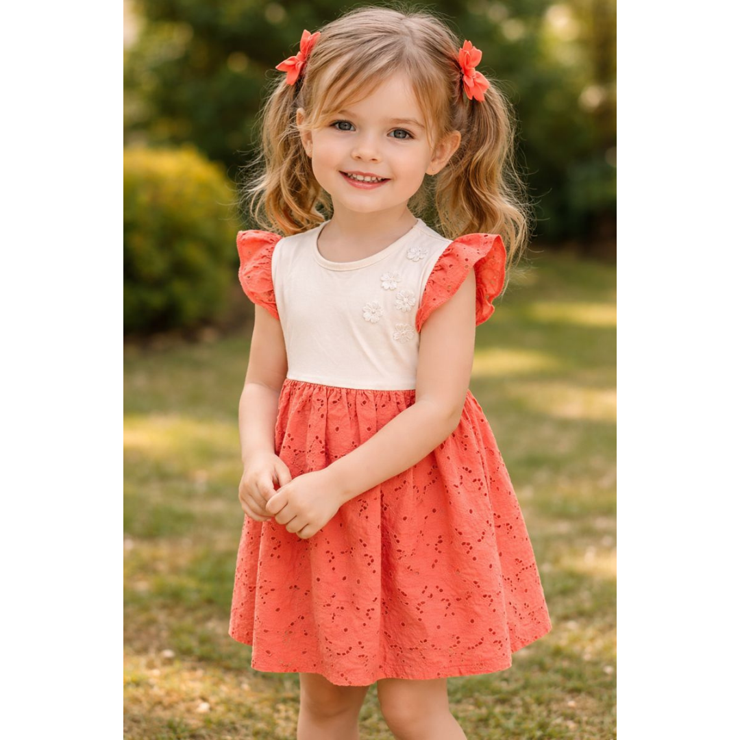 Kız çocuklar için özel olarak tasarlanan gipürlü kurdeleli pamuklu elbise, şık ve zarif detaylarıyla dikkat çekiyor.