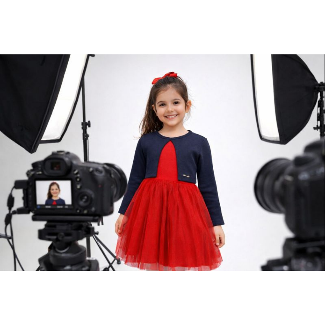 Şıklığı ve rahatlığı bir arada sunan kız çocuk hırkalı tüllü elbise takımı, lacivert renkli zarif hırkası ve astarlı tüllü eteğiyle özel günlerden günlük kullanıma kadar geniş bir kullanım alanı sunar.