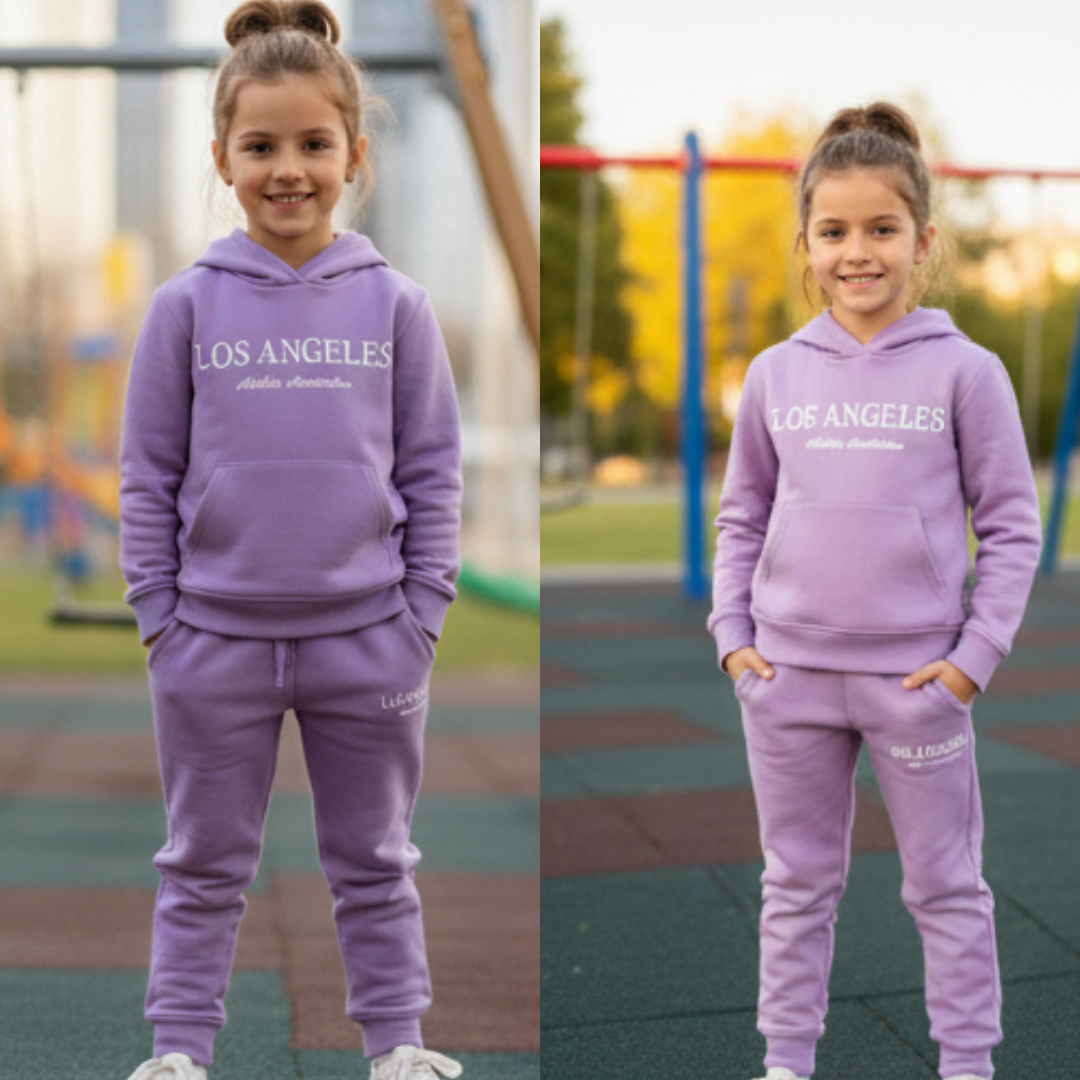 Kız çocukları için konfor ve şıklığı bir arada sunan lila kapüşonlu eşofman takımı, günlük kullanım ve spor aktiviteleri için ideal bir seçimdir. %100 pamuk örme kumaşı, yumuşak dokusu ve nefes alabilen yapısıyla gün boyu rahat bir kullanım sağlar.