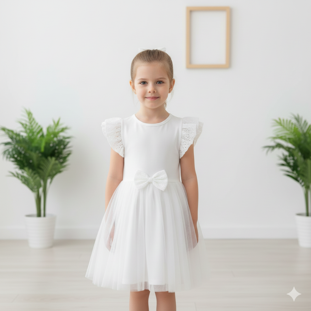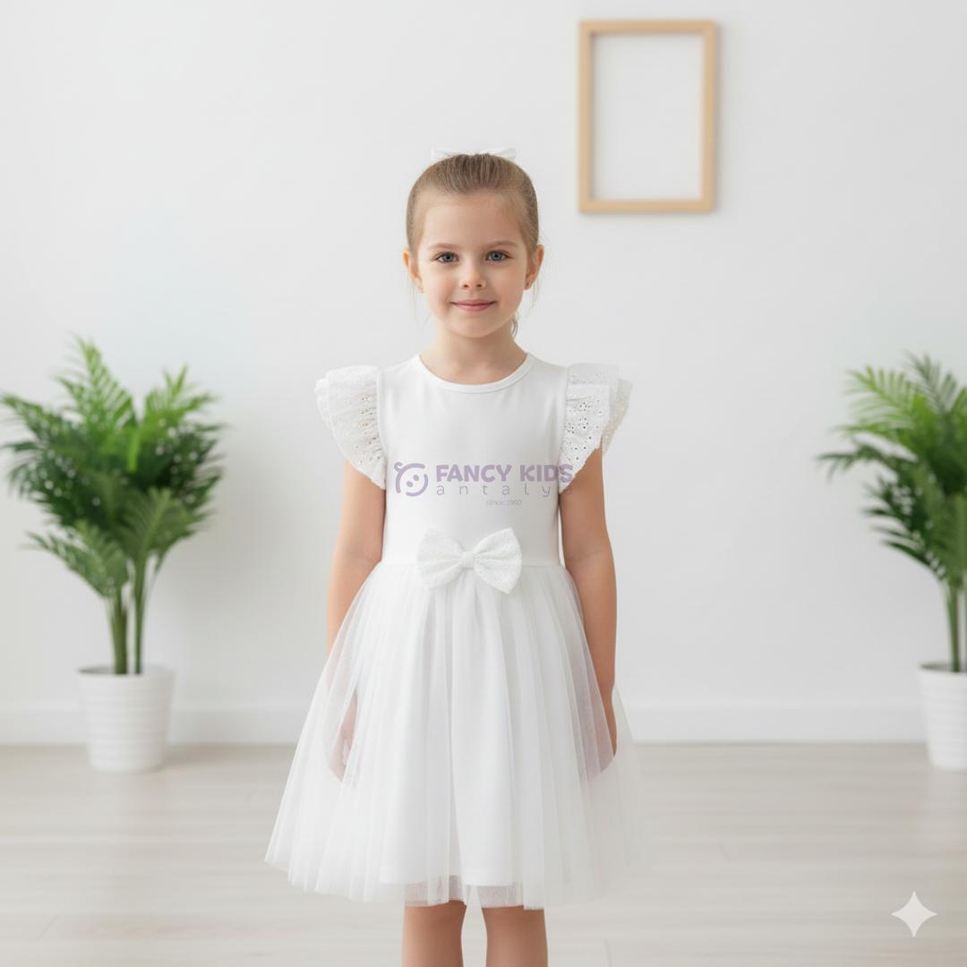 - Krem rengi kurdele ve tül detaylarıyla süslenmiş, şıklığı ve zarafeti bir arada sunan kız çocuk elbisesi.