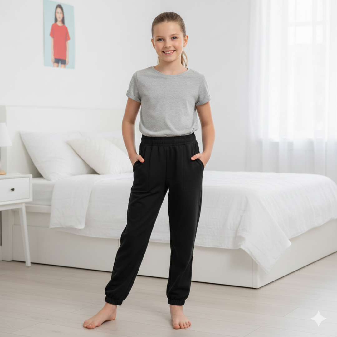 Kız çocukları için özel olarak tasarlanan bu pantolon, sade ve zamansız siyah rengiyle her mevsim tercih edilebilir.