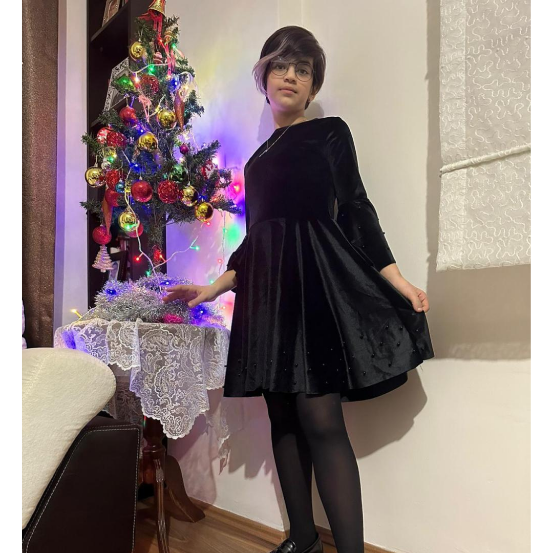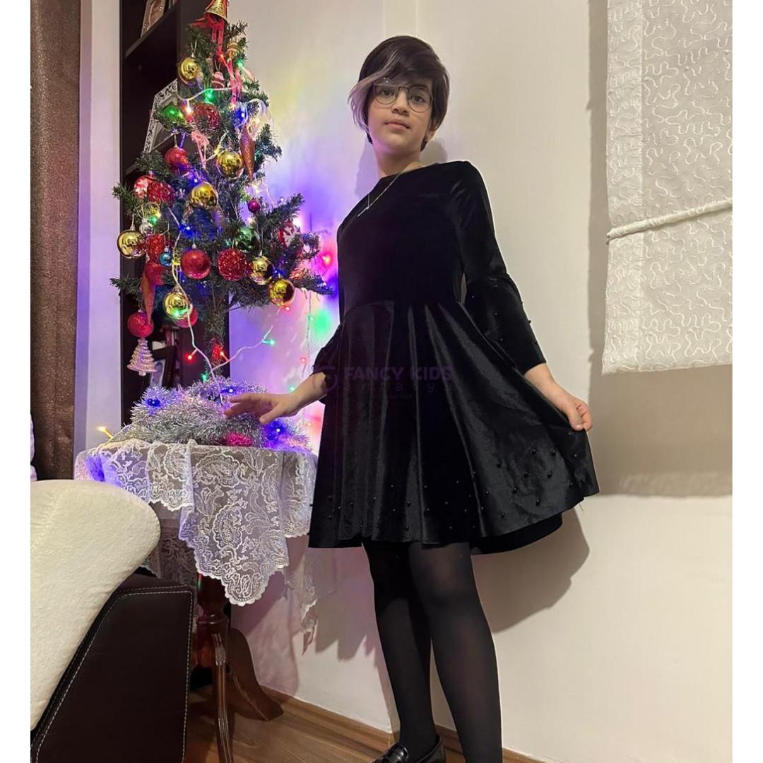 Kız çocuklar için tasarlanan siyah kadife elbise, zarafeti ve konforu bir araya getiriyor.