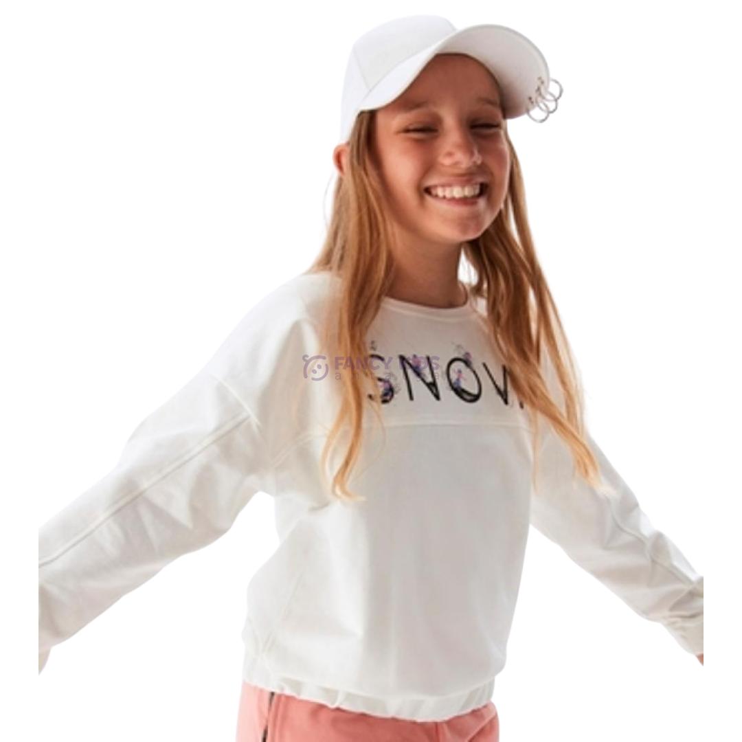 Bu ekru renkli kız çocuk sweatshirt, %95 pamuk ve %5 elastan içeriğiyle gün boyu konfor sunar.