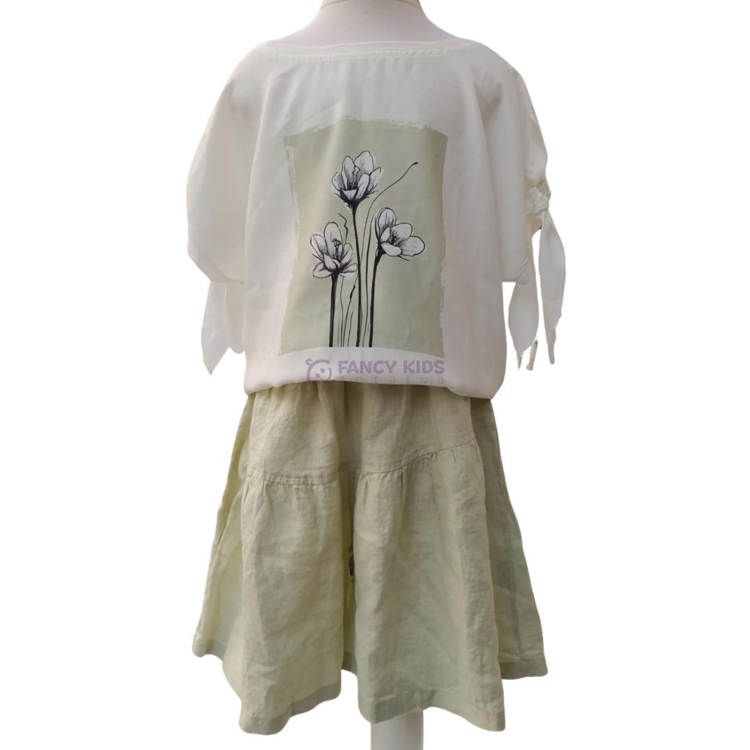 Takımın üst parçası, dijital baskı teknolojisiyle hazırlanmış çiçek desenli yeşil ve ekru tonlarında bluzdan oluşuyor.
